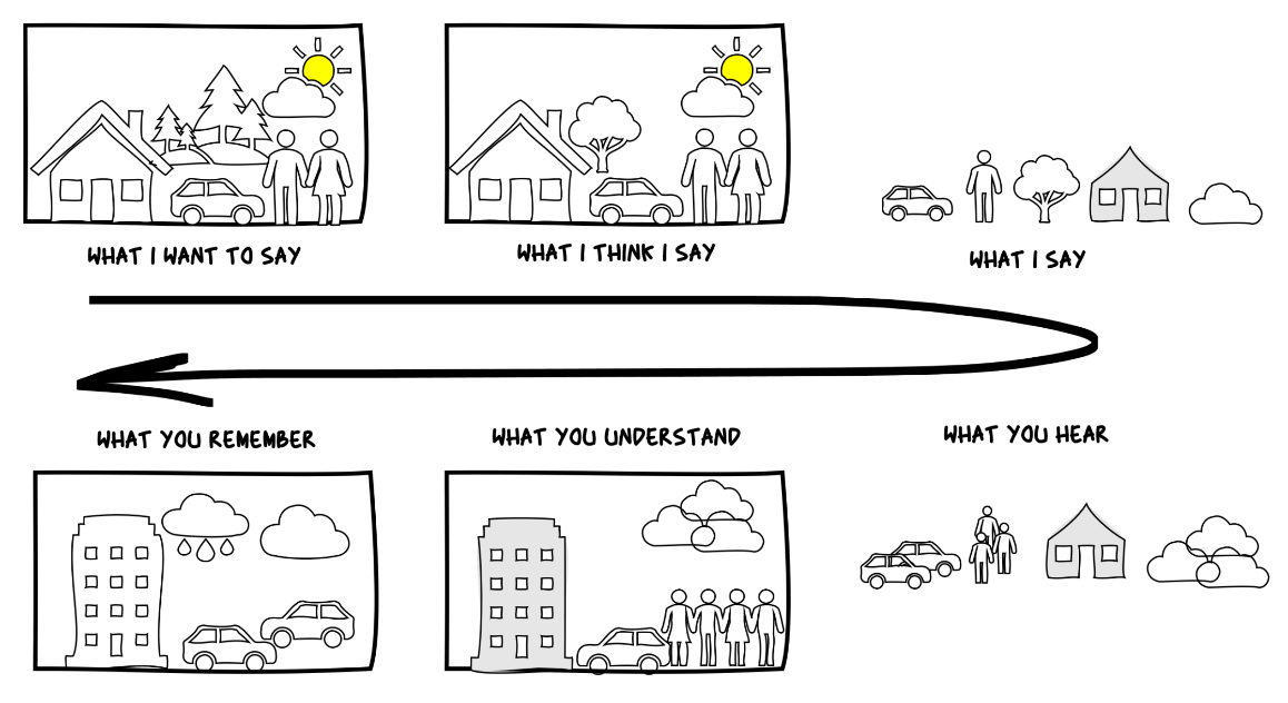 « Entre ce que je pense, ce que je veux dire, ce que je crois dire, ce que je dis réellement, ce que tu veux entendre, ce que tu entends, ce que tu crois comprendre, ce que tu veux comprendre, et ce que tu comprends réellement, il y a neuf possibilités de ne pas s’entendre ! »