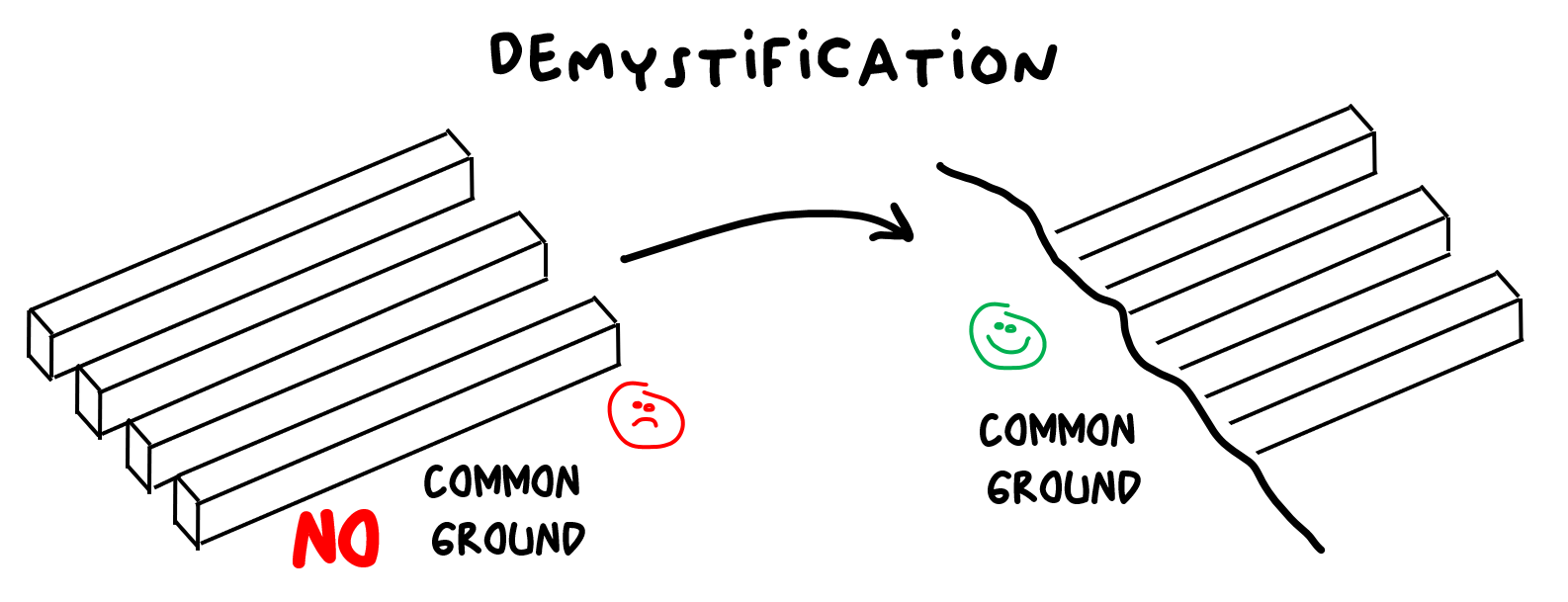 Demystification is the art of building common ground for a heterogeneous group of people. It is the difference between a complex and too detailed explanation understandable by a few, and a simplified version with key relevant details understandable by all the persons involved. – Dani Sastre