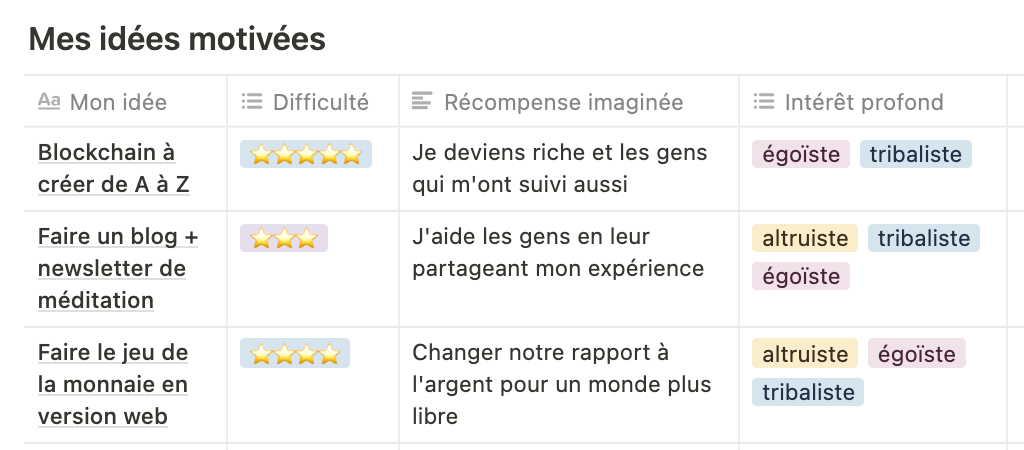 avec cette connaissance, je peux trier mes idées pour maximiser ma motivation dans une table comnme suit :