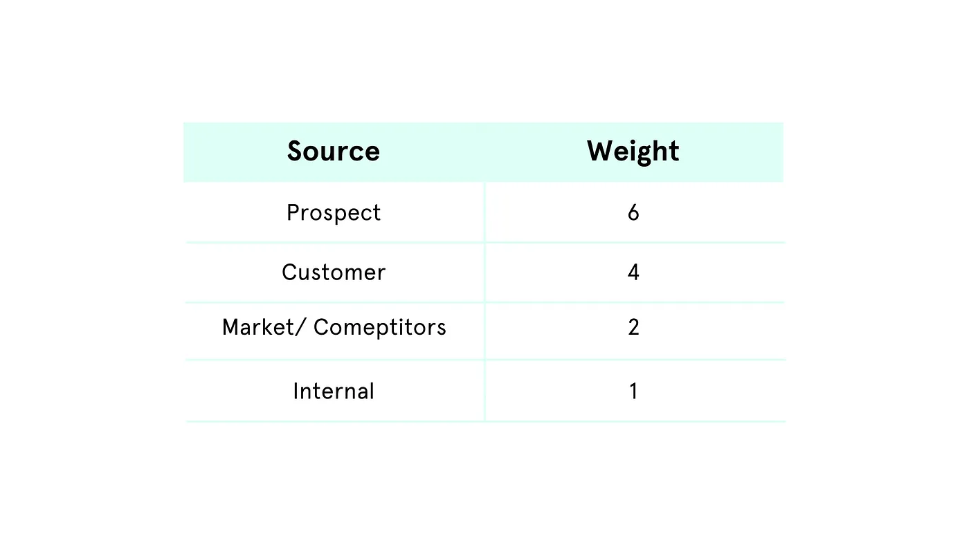 In my case, I had four sources — Prospect, Customer, Market/ Competition and Internal. Depending on your situation, you would weigh one of them higher over the other. Are you trying to optimize acquisition, retention, competition or internal productivity?