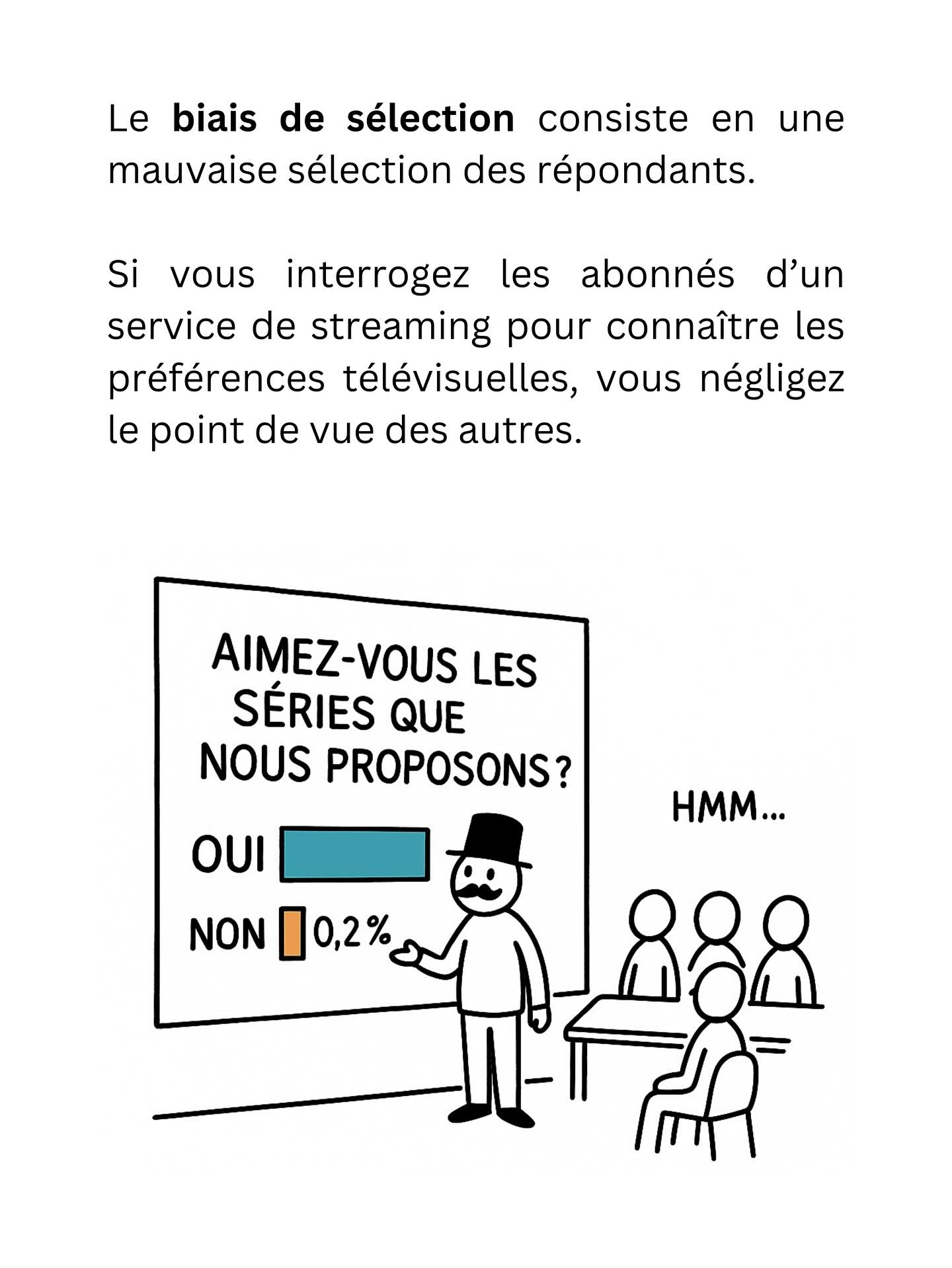 2. Le biais de sélection consiste en une mauvaise sélection des répondants. Si vous interrogez les abonnés d’un service de streaming pour connaître les préférences télévisuelles, vous négligez le point de vue des autres.