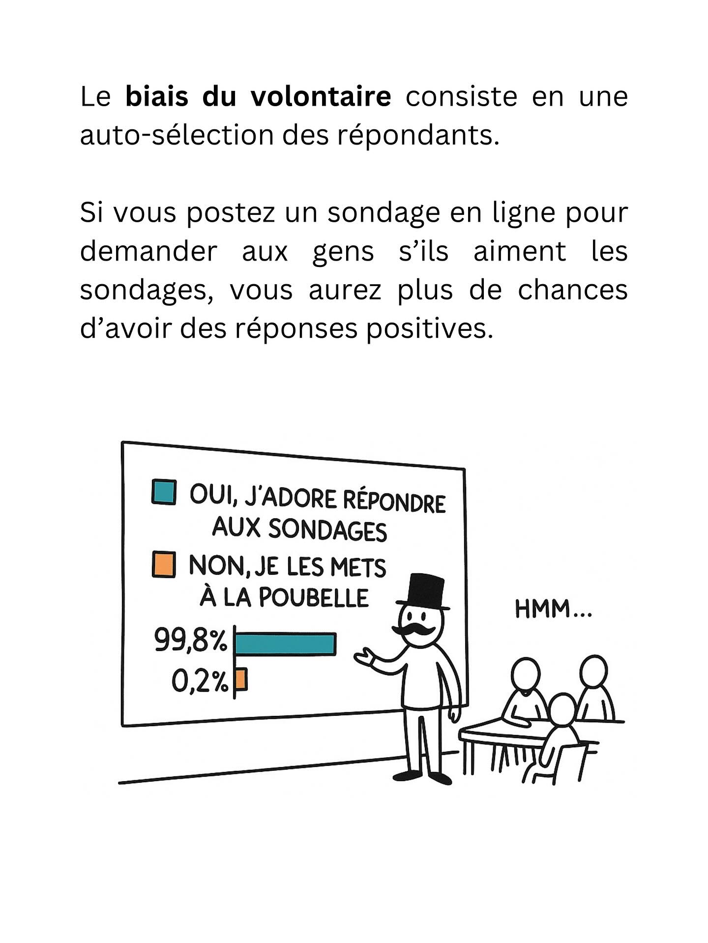 1. Le biais du volontaire consiste en une auto-sélection des répondants. Si vous postez un sondage en ligne pour demander aux gens s’ils aiment les sondages, vous aurez plus de chances d’avoir des réponses positives.
