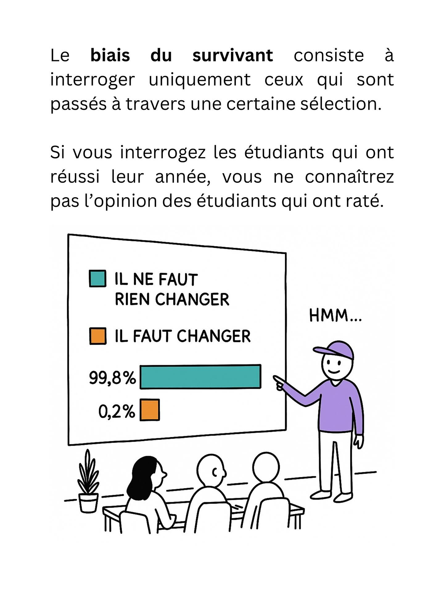 3. Le Biais de succès ou du survivant consiste à interroger uniquement ceux qui sont passés à travers une certaine sélection. Si vous interrogez les étudiants qui ont réussi leur année, vous ne connaîtrez pas l’opinion des étudiants qui ont raté.