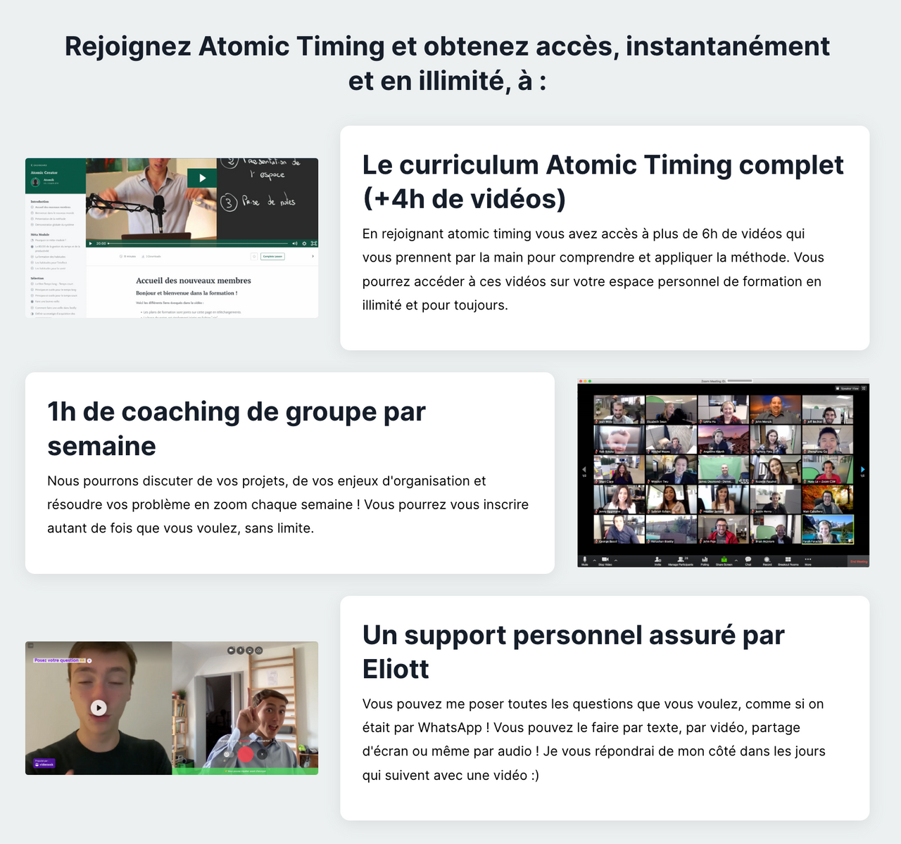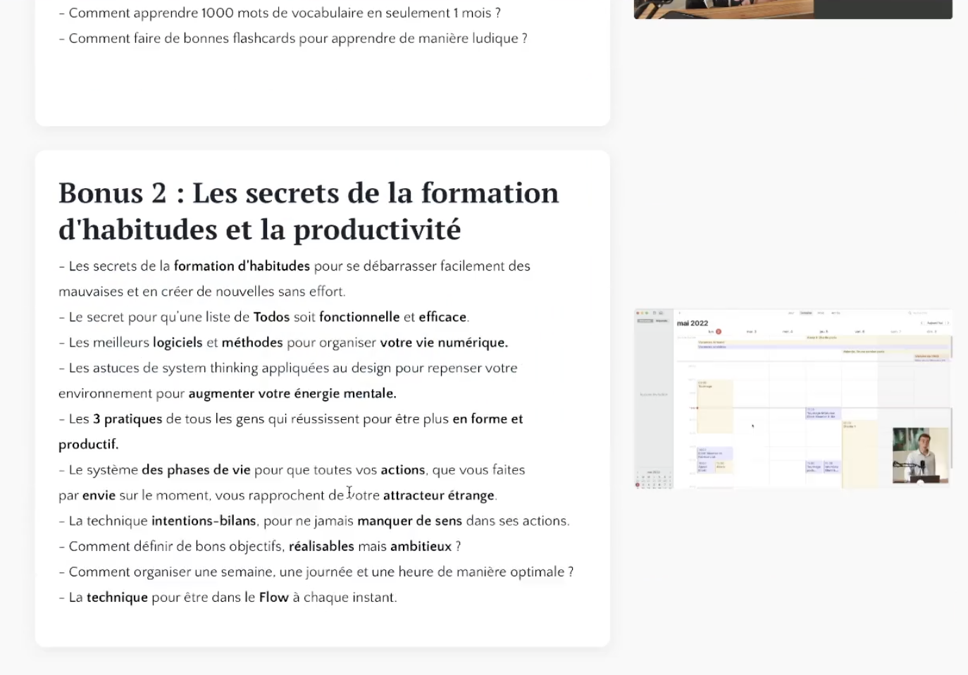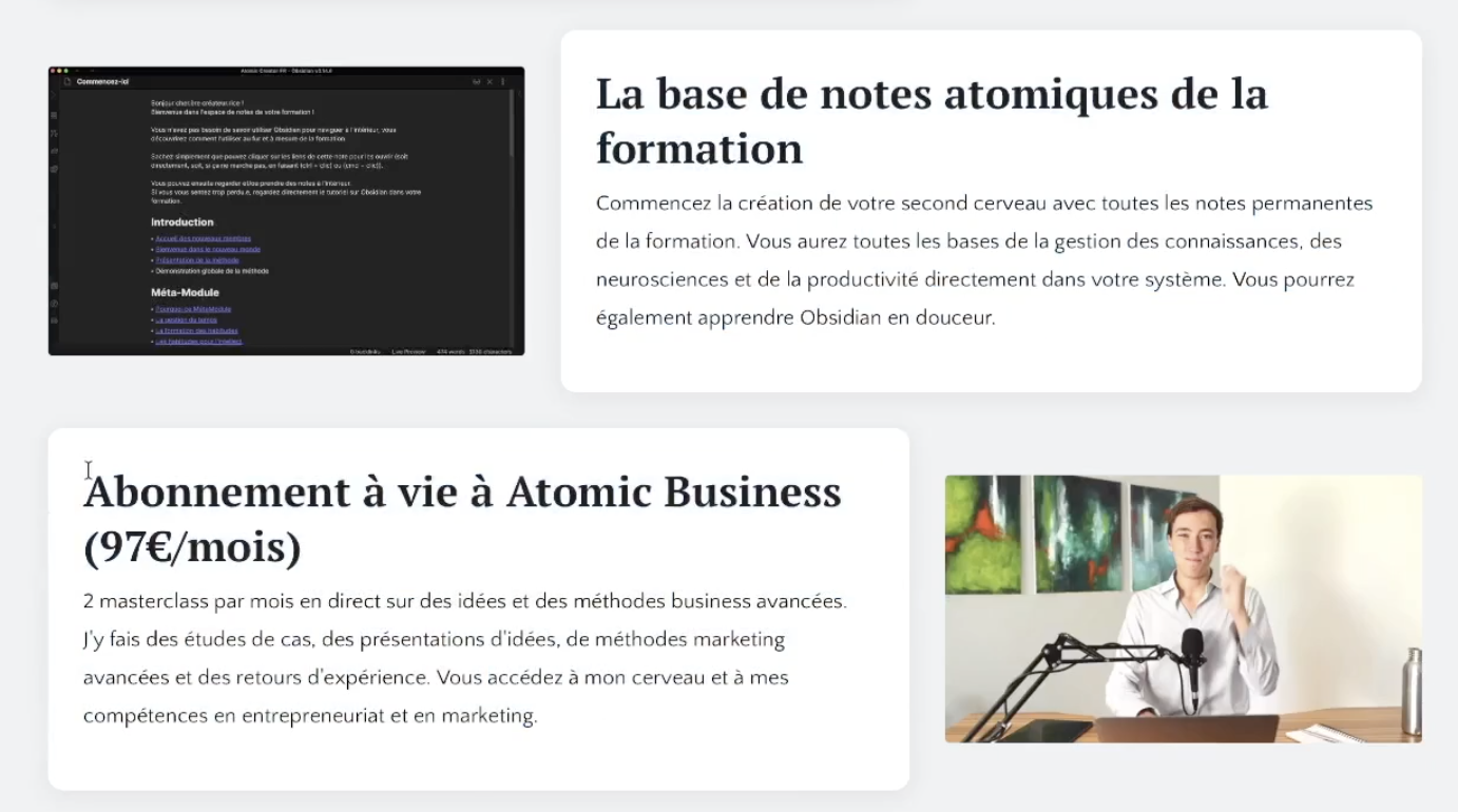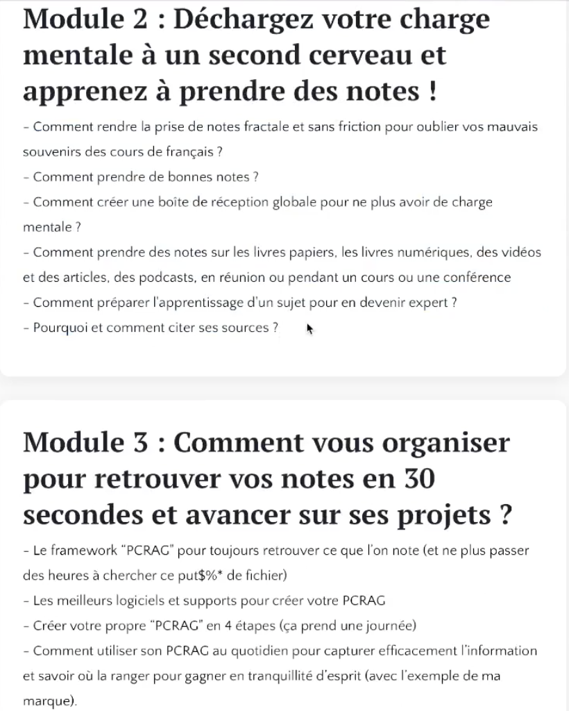 • La présentation des module, avec les bénéfices de chaque module (toujours avec des ‘ce truc là pour…’, ex: “Mon protocole de lecture en 5 étapes pour faire passer votre premier jet de ‘banal’ à ‘Woah!’”)