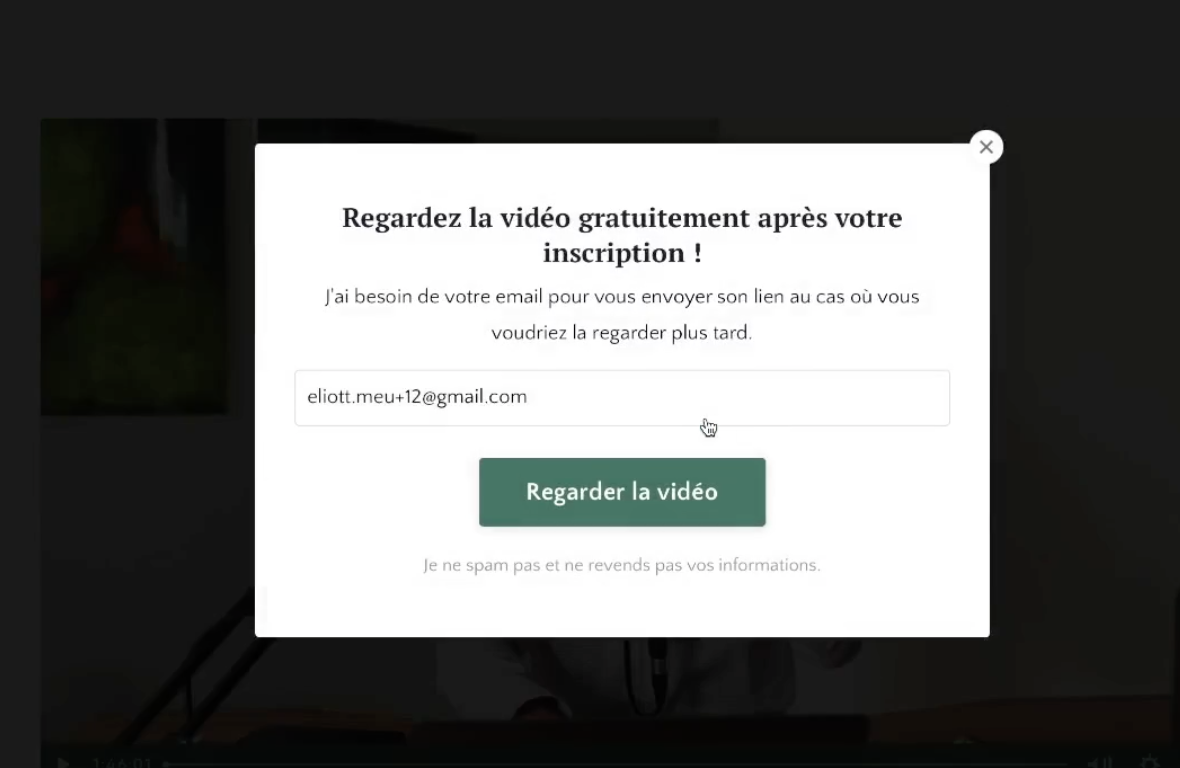 Il vaut mieux directement mettre la vidéo dans la page, et au moment de cliquer, le site demande leur email (avec une justification claire). Les utilisateurs ont alors un biais pour ne pas tomber en Dissonances cognitives.